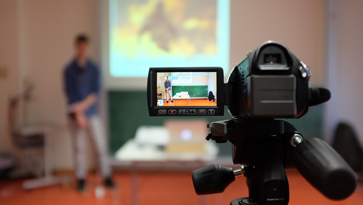 Wie in jedem Jahr endete das in der Schule durchgeführte Programm mit der Vorstellung kleiner Präsentationen, die von den Teilnehmern zwischen den beiden Seminartagen konzipiert-, und die zur gemeinsamen Analyse mittels Videoaufnahmen dokumentiert und zum Abschluss des Trainings im Plenum ausgewertet wurden. In dieser Phase bekommen die Schülerinnen und Schüler noch einmal einen Blick von außen auf sich selbst und Feedback durch die Gruppe, was auch noch heute in unserer multi- und hypermedial vermittelten Lebenswirklichkeit, in der wirklich alles kommentiert, geliked oder disliked wird, nicht selten ungewohnt erscheint und neue Erkenntnisse über sich selbst bringt („so oft sage ich ähm?“, „man, was wackel ich da so rum?“) und einen Anlass schafft, um an den so genannten Selbstkompetenzen Feintuning zu betreiben.