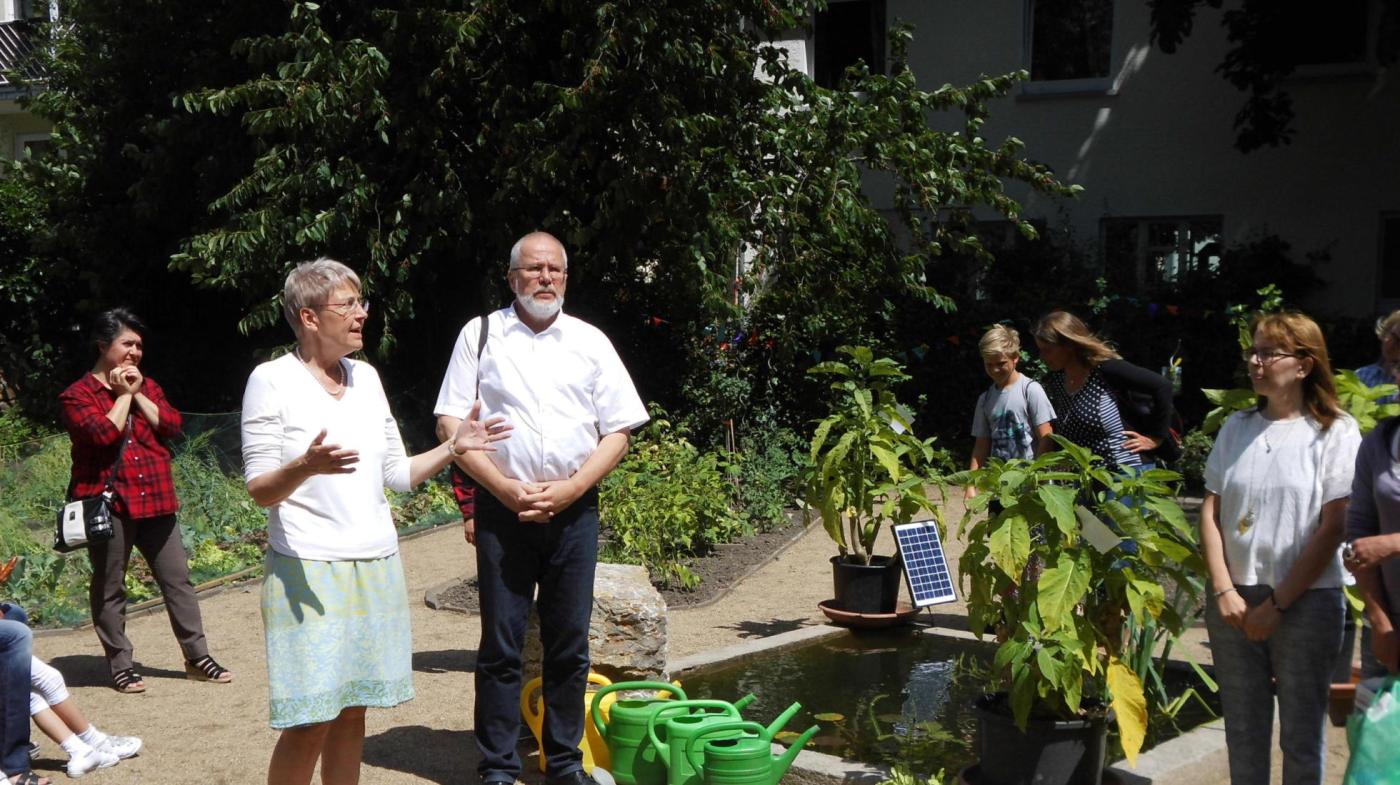 Bild: Bürgermeisterin Gerda Weigel-Greilich und Schulleiter Werner Nissel sind beeindruckt vom restaurierten Garten. (Quelle: Schepp)