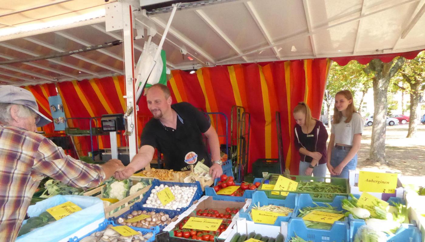 »Sellerie frischt den Atem auf und reinigt die Zähne«, stand da auf einem Plakat zu lesen. »Rohe Zwiebeln bekämpfen Bakterien im Mund« oder »Karotten verhindern das Entstehen von Karies«. Die Teenager haben sich im Chemie- und im Kunstunterricht mit gesunder Ernährung auseinandergesetzt, haben Werbung für Obst und Gemüse gestaltet – und gemeinsam mit Kunstlehrerin Katharina Schreiber haben die Schüler der Gießener Ricarda-Huch-Schule ihre Plakate und Werbeschilder am Stand von Michael Zörkler angebracht, um so den Verkauf der Produkte zu unterstützen.