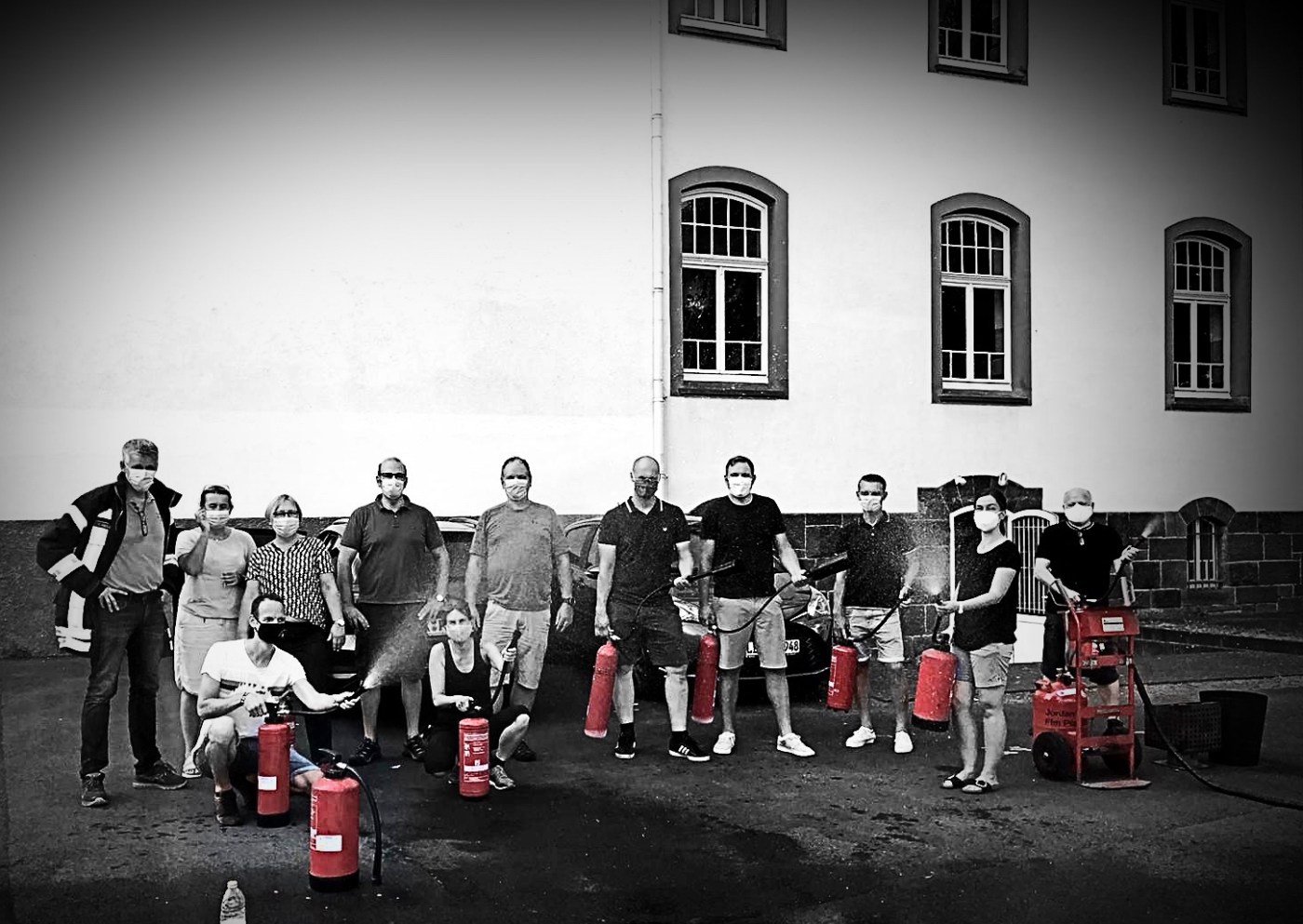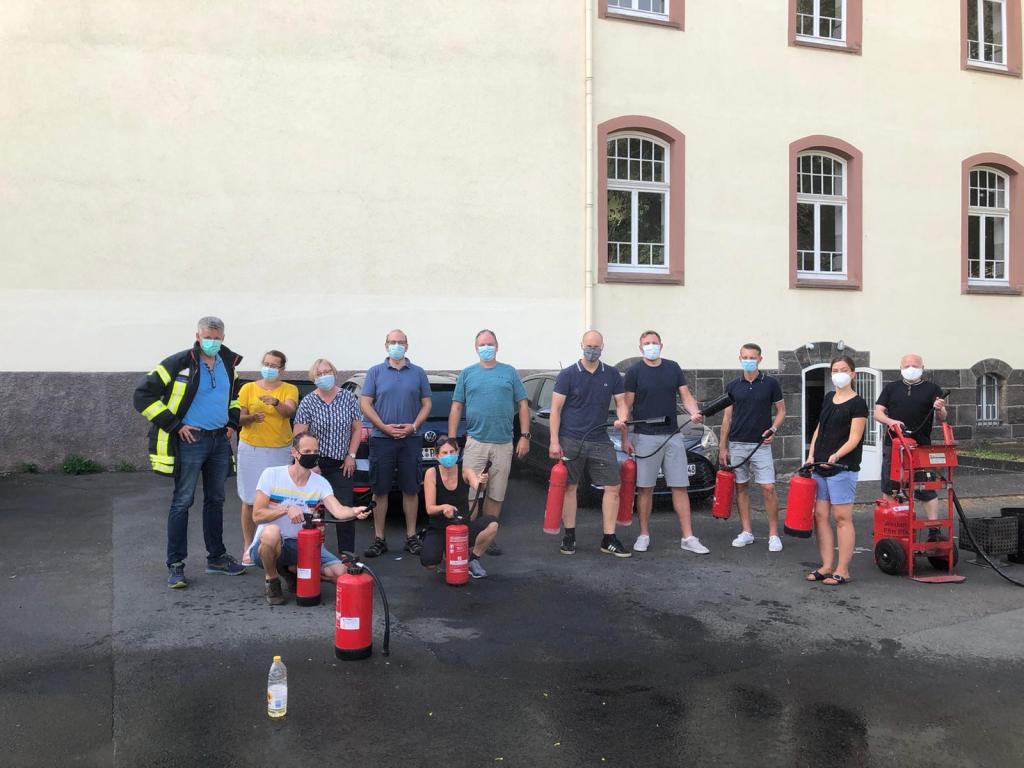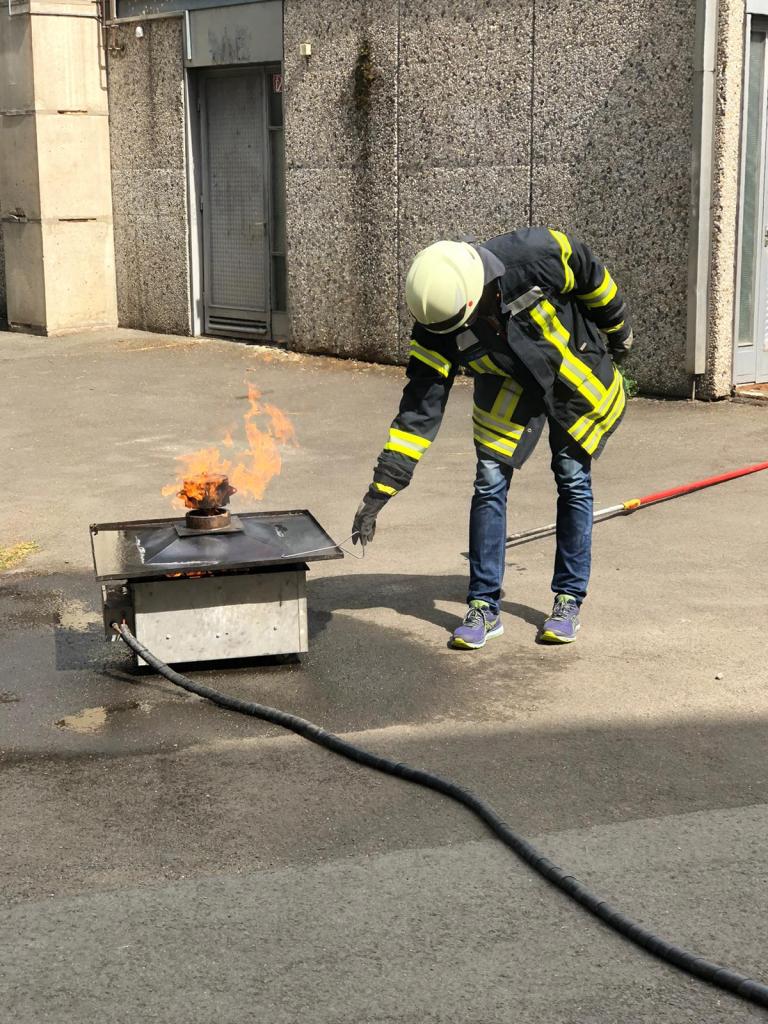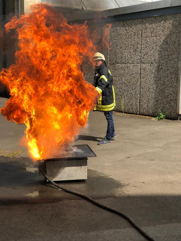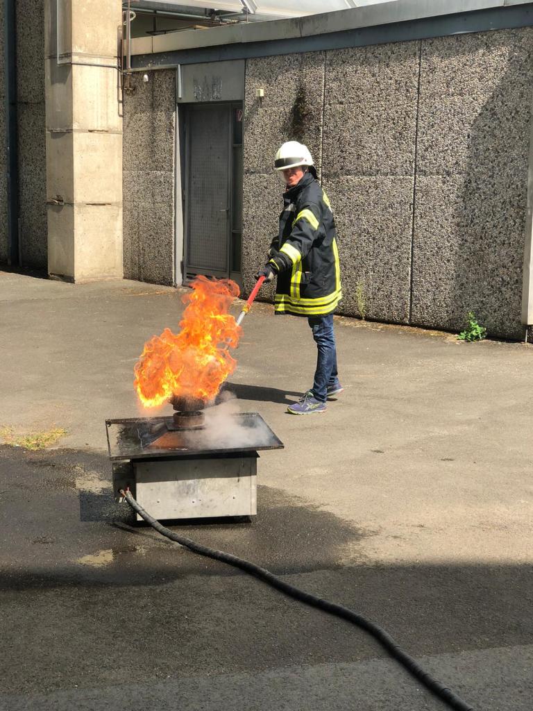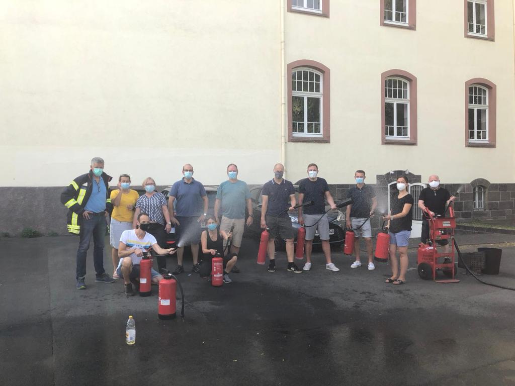 Genau hier hat eine Fortbildung zum Brandschutz angesetzt, die unsere Schulleitung am 23.08. gemeinsam absolviert hat. Wie man anhand der Bilder unschwer erkennen kann, kennen sich alle Beteiligte mit dem notwendigen Gerät und der Flammenbekämpfung nun bestens aus.