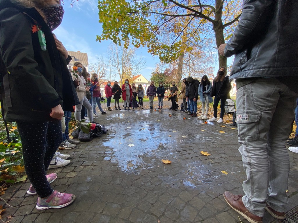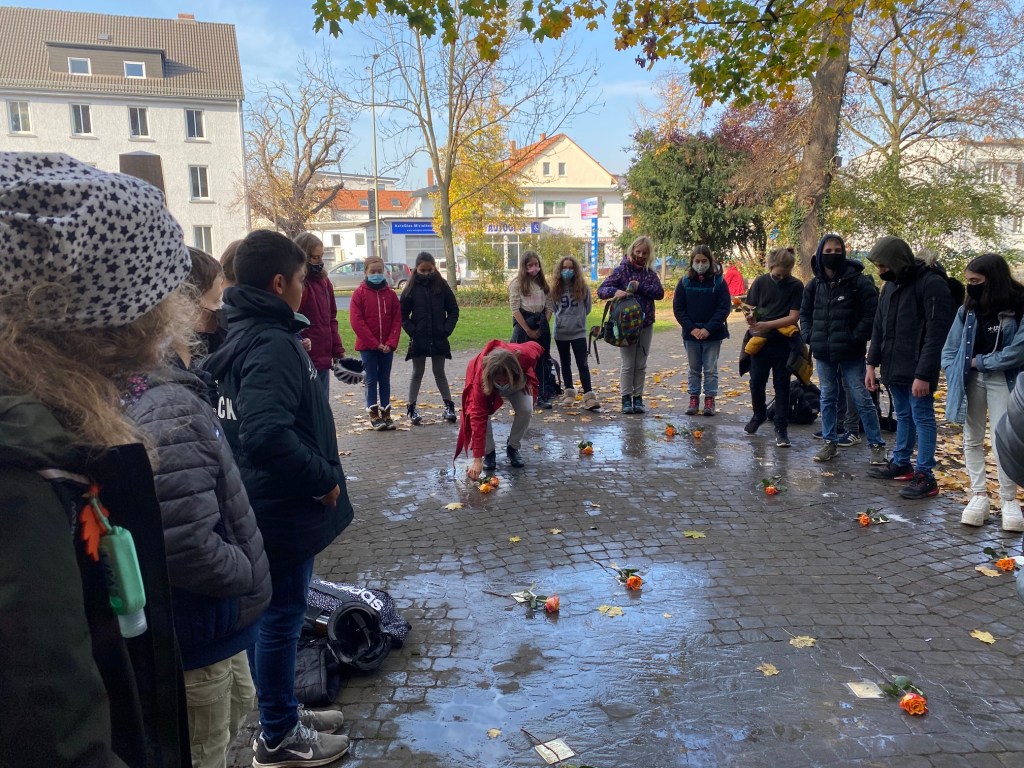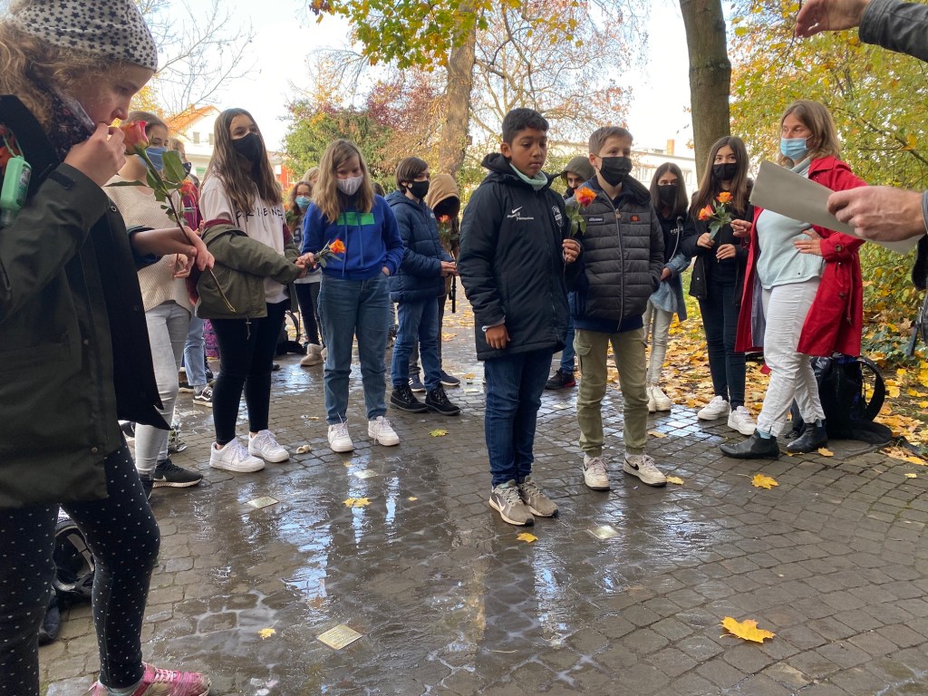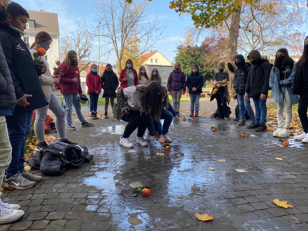 Im Rahmen unseres Erinnerungstags am 09. November zum Gedenken der Opfer des Nationalsozialismus sowie der Gewalttaten der vom nationalsozialistischen Regime organisierten und gelenkten Reichspogromnacht vom 09. auf den 10. November des Jahres 1938 haben Schülerinnen und Schüler der Jahrgangsstufe 6 zusammen mit ihrem Lehrer Rolf Weinreich und Ihrer Lehrerin Katharina Schreiber unserer ehemaligen Schülerinnen und Schüler gedacht, die in der Zeit des Nationalsozialismus deportiert und ermordet wurden.