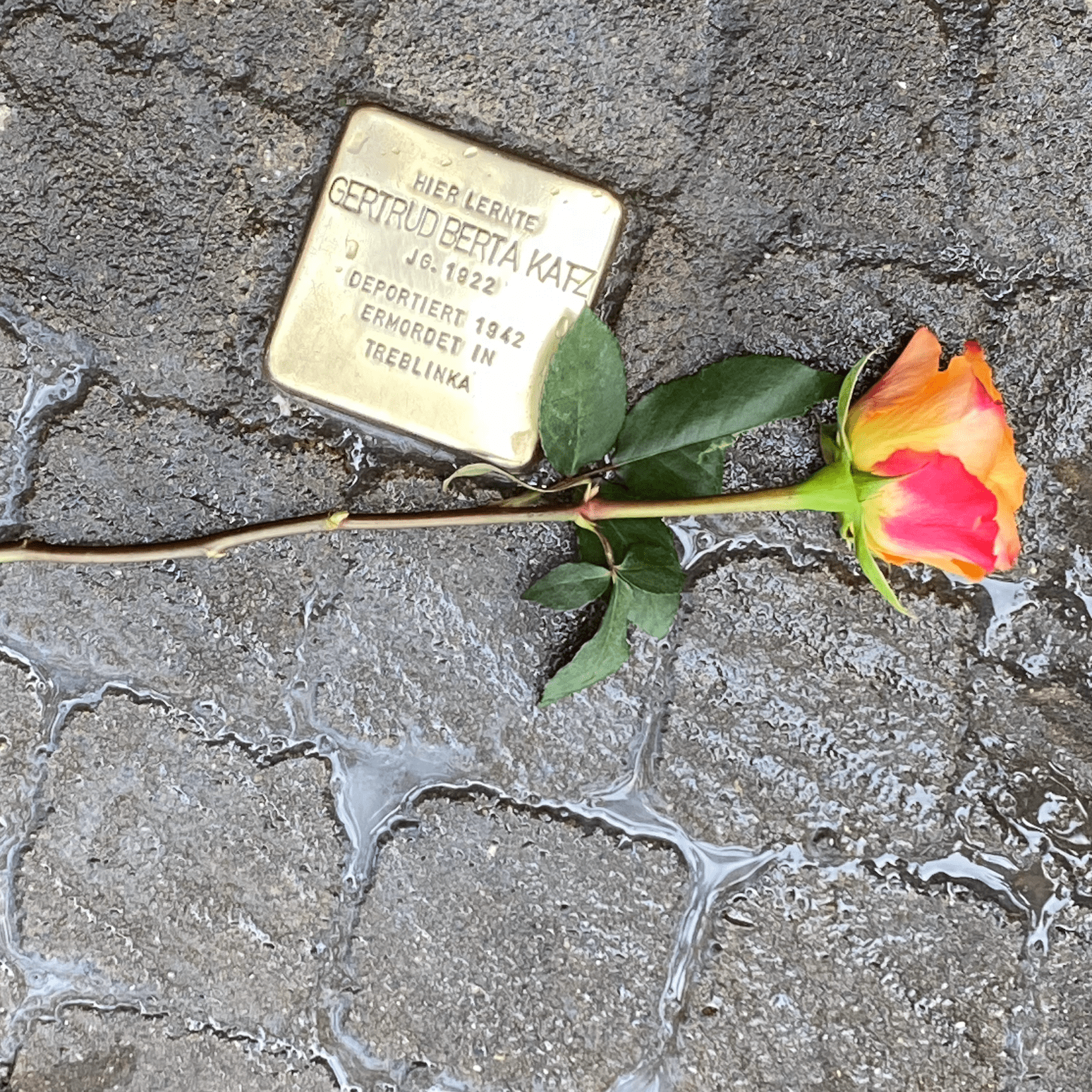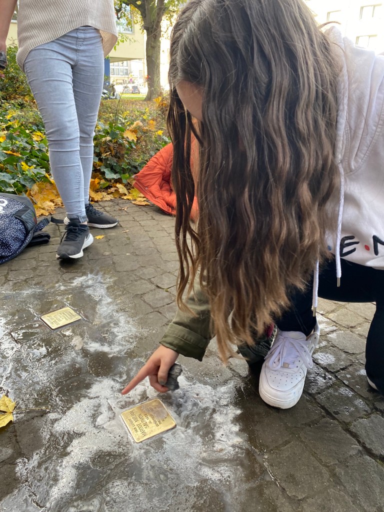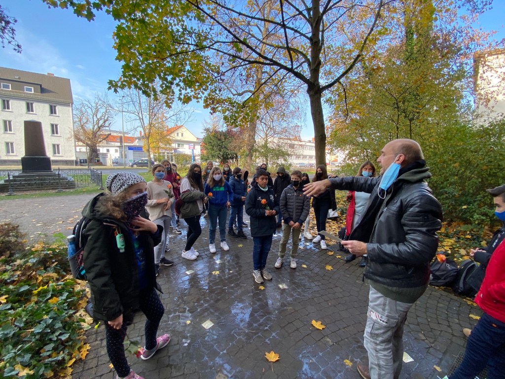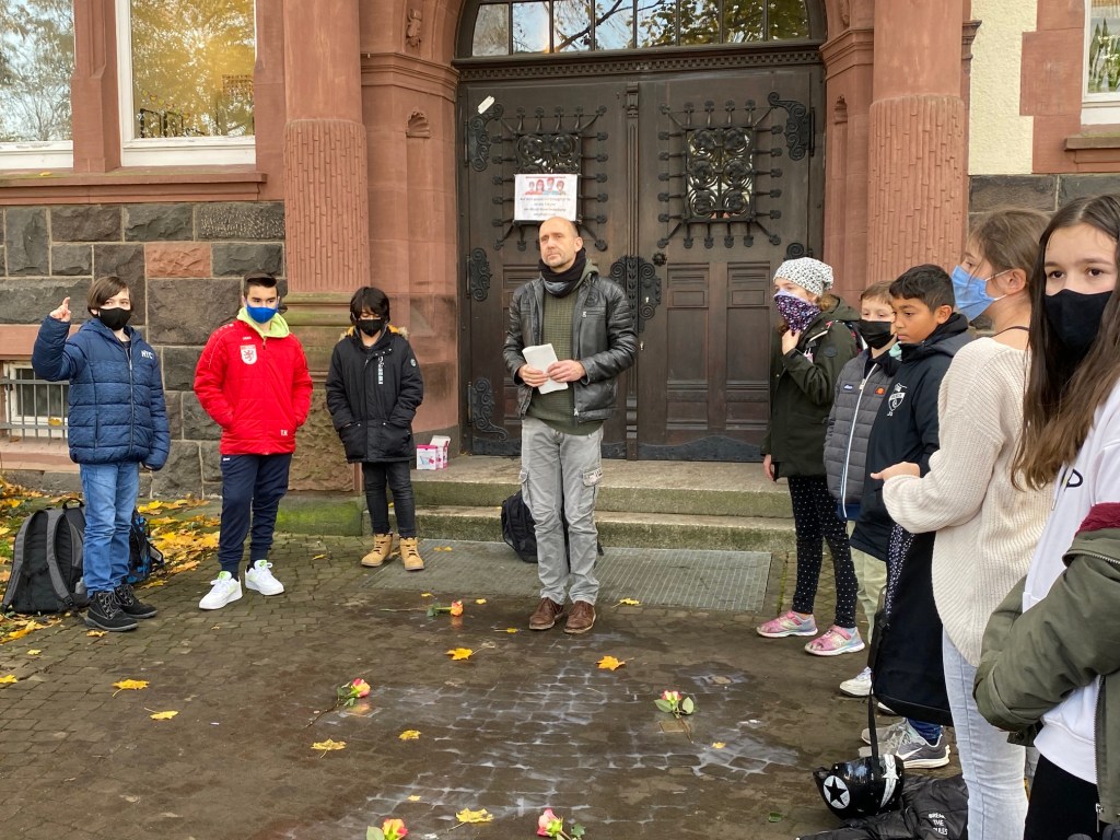 Im Rahmen unseres Erinnerungstags am 09. November zum Gedenken der Opfer des Nationalsozialismus sowie der Gewalttaten der vom nationalsozialistischen Regime organisierten und gelenkten Reichspogromnacht vom 09. auf den 10. November des Jahres 1938 haben Schülerinnen und Schüler der Jahrgangsstufe 6 zusammen mit ihrem Lehrer Rolf Weinreich und Ihrer Lehrerin Katharina Schreiber unserer ehemaligen Schülerinnen und Schüler gedacht, die in der Zeit des Nationalsozialismus deportiert und ermordet wurden.