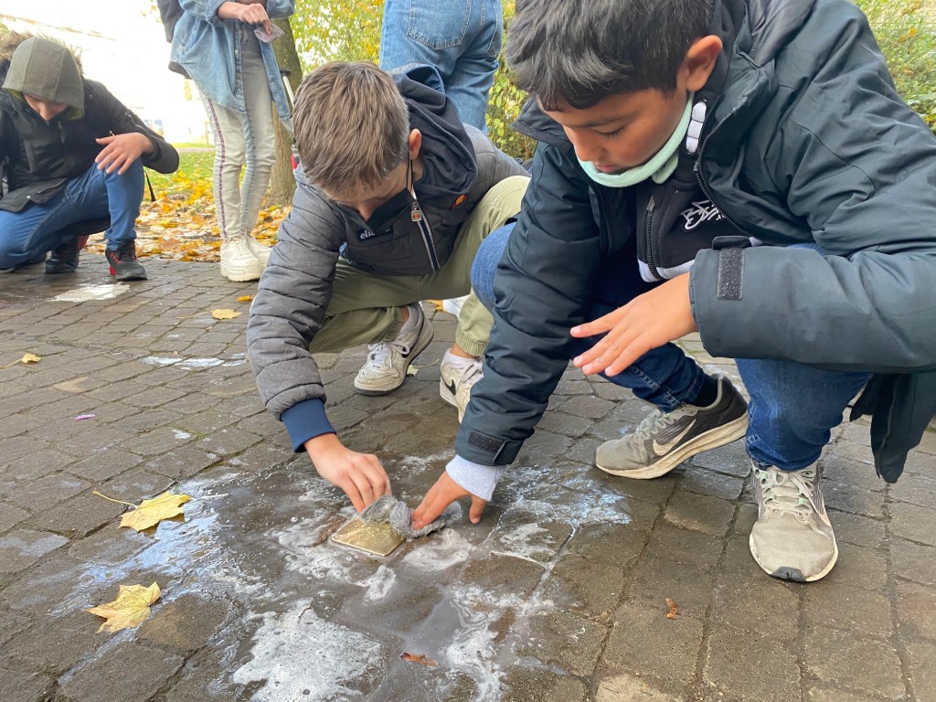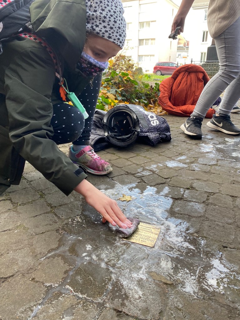 Wie in jedem Jahr haben die Schülerinnen und Schüler vor der Blumenniederlegung die Messinggedenktafeln gesäubert und poliert, sodass sie dem ehernen Andenken an unsere ehemaligen Mitschüler*Innen auch gebührend entsprechen können. Die Erinnerungen an sie, so könnte man sagen, wurden von ihren Mitschülerinnen und Mitschülern von heute wieder aufgefrischt.
