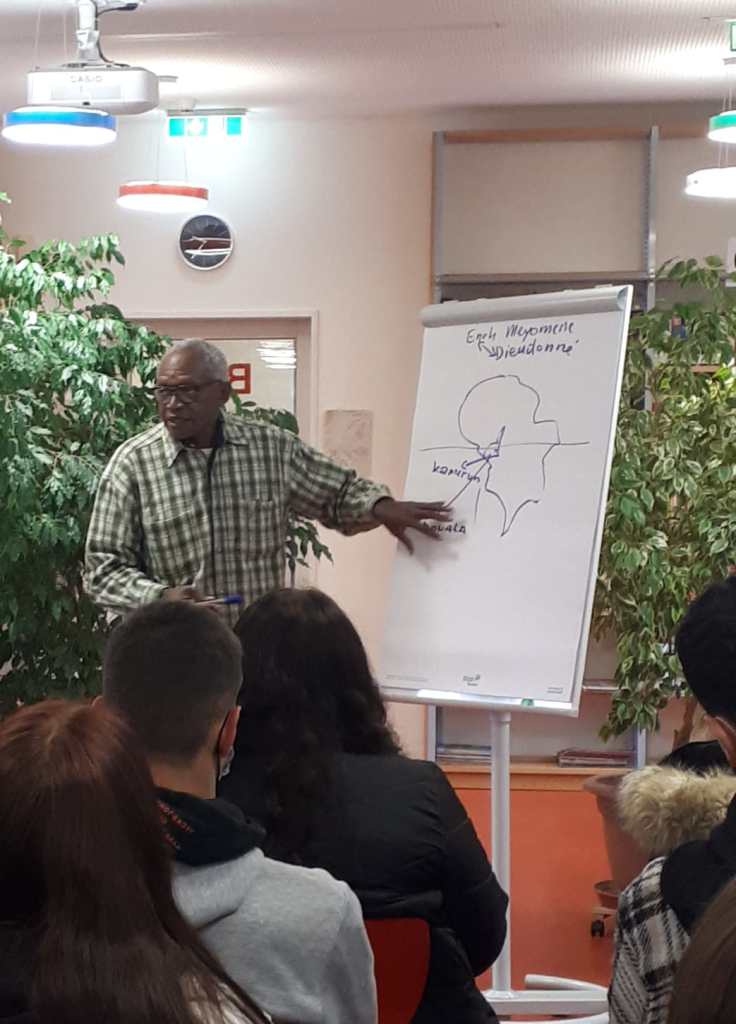 Im Rahmen des letzten Halbjahresthemas „A la rencontre de l’autre” („Dem Anderen begegnen“) stellte er sich den Fragen der Schüler*innen und berichtete über seine Kindheit im Süden Kameruns, sein Studium in Frankreich, sein frühes Interesse an Literatur und seinen Weg in die Politik, der ihm im Rahmen seiner Kandidatur zur Präsidentschaftswahl 2011 zum Verhängnis wurde, weil er grundlos inhaftiert und insbesondere in den ersten Wochen absolut menschenunwürdig behandelt wurde. Besonders die lebendige Erzählweise des Gastes, der trotz dieser einschneidenen Erlebnisse etwas absolut Positives ausstrahlte und der erst sein Schicksal akzeptieren musste, um dann produktiv zu werden und mehrere Romane und Gedichte während der Gefängniszeit zu schreiben, beeindruckte die Zuhörenden.