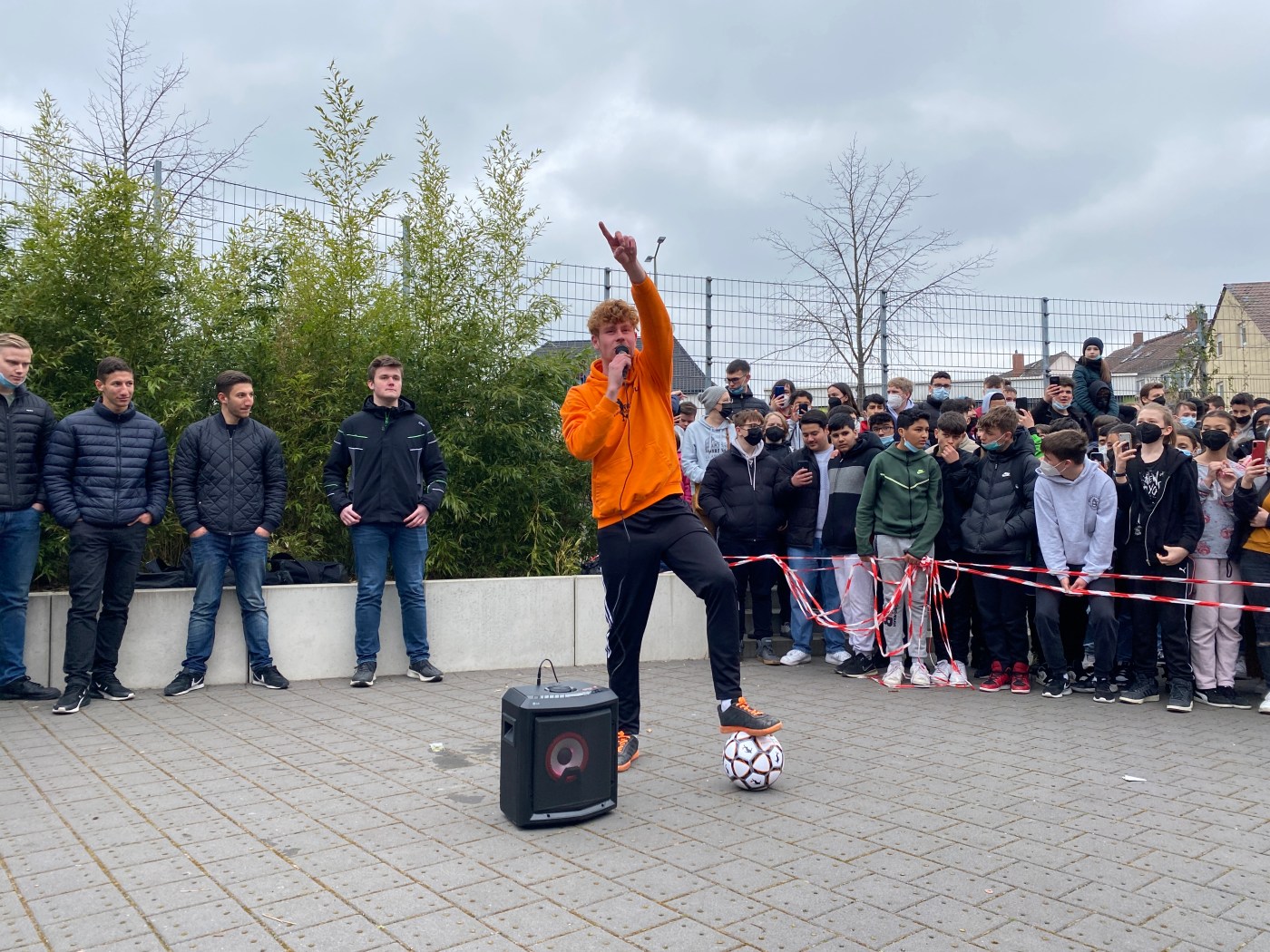 „Ich war auch mal sein Physiklehrer“, „Ich hatte ihn in Deutsch“, „bei mir hatte er Sport, also wenn das nicht prägend war“ – auch bei Lehrerinnen und Lehrern war ein Hauch von Fame Game zu spüren, als bekannt wurde, dass der sympathische Ballzauberer Jannik Freestyle (mit bürgerlichem Namen Jannik Singpiel) auf seiner Deutschlandtour an seiner alten Schule einen Zwischenstopp einlegen würde. Was Reichweite in den sozialen Medien heute wirklich bedeutet, wie das aussieht, wenn man heute die Millionenmarke bei TikTok hinter sich gelassen hat, darüber staunten die älteren Semester dann aber doch. Bei seinem Einlauf zündete das zuvor schon brodelnde Publikum wie bei einem musikalischen Großevent, egal ob Fünftklässler oder Oberstufenschüler, Jannik nahm sie alle in seinen Bann, performte mit eigenen Bällen auf eigenem Song und alle sangen mit, bejubelten seine Tricks, derer er über 300 beherrscht. Dabei gab sich Jannik äußerst nahbar und gewinnend, mit gutem Draht zu den Kids, schließlich hat er eine Mission, und zwar neben maximalem Spaß im Leben so vielen Kindern und Jugendlichen wie möglich zu zeigen, dass draußen Kicken viel cooler ist als drinnen Zocken. So ist der Kickkönner und Social Media Star nicht nur Showact und Influencer, sondern gibt sich auch als Coach in Workshops, in denen er jungen Menschen seine Skills weitergibt. Und das kommt an. Auch wenn Jannik nicht viel Zeit hatte, ließ er es sich nicht nehmen, einer Schülerin und einem Schüler schnell mal einen Trick beizubringen. Überglücklich ließen auch sie sich von der Menge feiern. Dass das Leben an der Ricarda für ihn schon einmal ruhiger und geordneter zuging, davon konnte sich Jannik ein Bild machen, als er wieder abreisen wollte. Abgeschirmt wie ein Schwergewichtsboxweltmeister auf seinem Weg in den Ring war durch die jubelnde Schülerschaft kaum ein Durchkommen. Schön war’s. Hab Dank für’s Kommen!