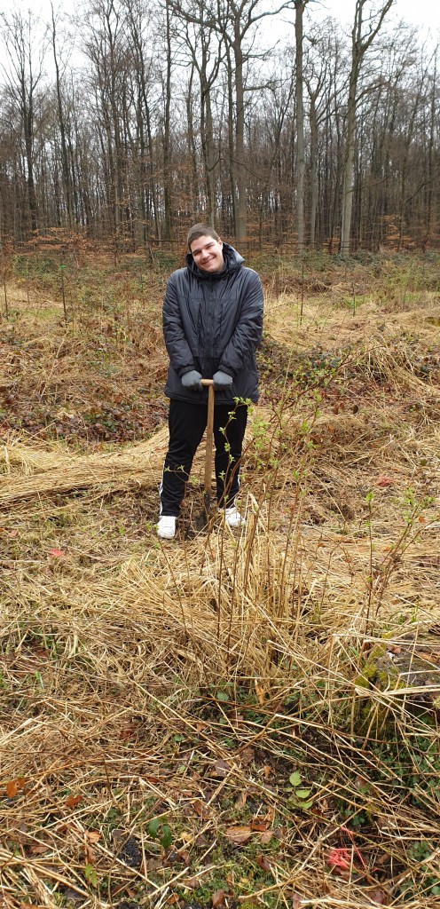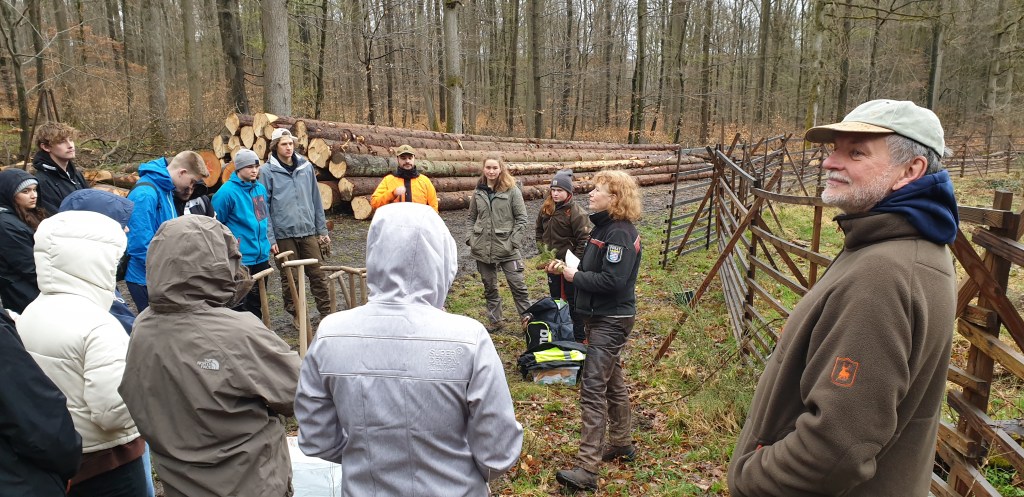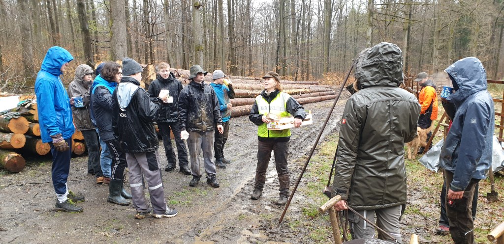 Zum Abschluss fanden sich alle an einer Feuerstelle ein. Es gab warmen Apfelsaft und Kekse. Die Stimmung war heiter und gelöst. Am Ende verabschiedeten sich die Schüler:innen und Lehrer von den Mitarbeiter*innen von Hessen Forst und der „Schulwiese“, wie das Gelände benannt ist, auf dem die Bäume gepflanzt wurden. Passend!