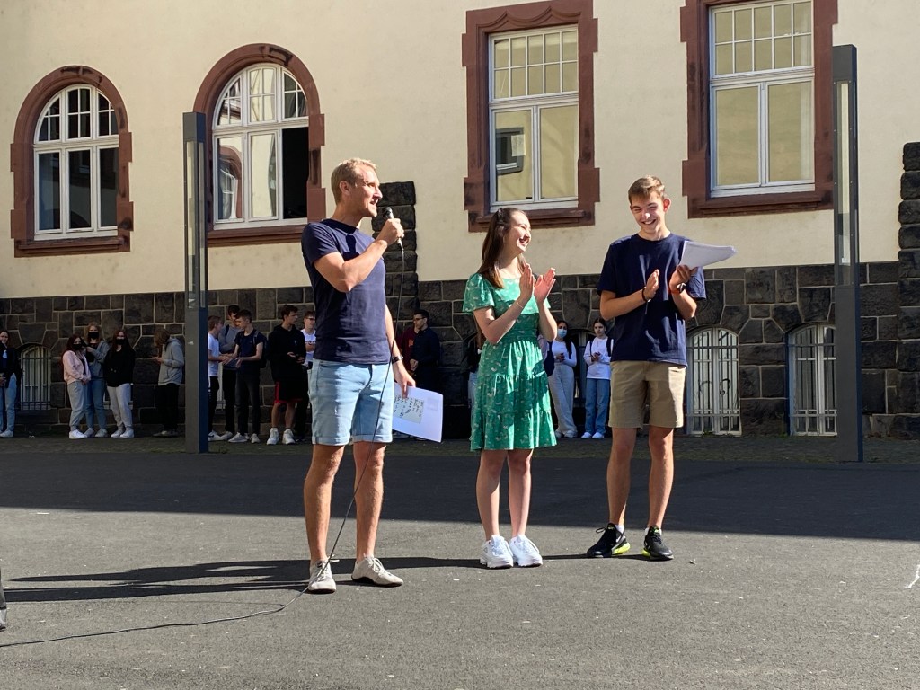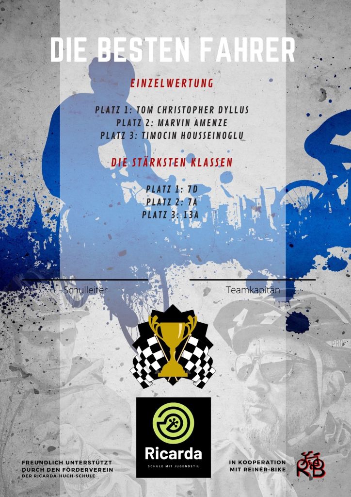 Drei Wochen Stadtradeln liegen hinter uns. Die generelle Ermattung der Coronazeit war und ist auch hier zu spüren gewesen. Das ambitionierte avisierte Ziel, mit einer großen Schar an Radlerinnen und Radlern kilometertechnisch einmal um die Welt zu gelangen, konnte auch in diesem Jahr nicht erreicht werden. Wir kamen mit etwa 10.000 Kilometern einmal nach New York und leider nicht mehr zurück, so der Teamcaptain der Ricarda Christian Schmidt, der am heutigen Tag seine Teammitgliedern zusammen mit Schulsprecherin Isabel Sanson und Schulsprecher Tom Christopher-Dyllus ehrte und ihnen neben Urkunden kleine Präsente unseres Kooperationspartners Rainer Bike überreichte Und dennoch: Platz 12 von über 100 Teams in Gießen. Platz 4 unter den Gießener Schulen, respektable Spitzenwerte wie etwa die über 700 gefahrenen Kilometer unseres erstplatzierten Schulsprechers Tom-Christopher Dyllus geben genug Grund und Anlass dazu, dass alle, die für das Team RICARDA mitgefahren sind, sich mal auf die Schulter klopfen dürfen. Im nächsten Jahr greifen wir halt wieder an und sollten uns als zertifizierte Bike-School auch nicht lumpen lassen. Vielleicht schaffen wir es, den Wettbewerb intensiver in die Bewegungsangebote und auch in den Unterricht einzubinden. Die Ressourcen wären da, verfügt doch die RICARDA mittlerweile über eine gut ausgestattete Radflotte.