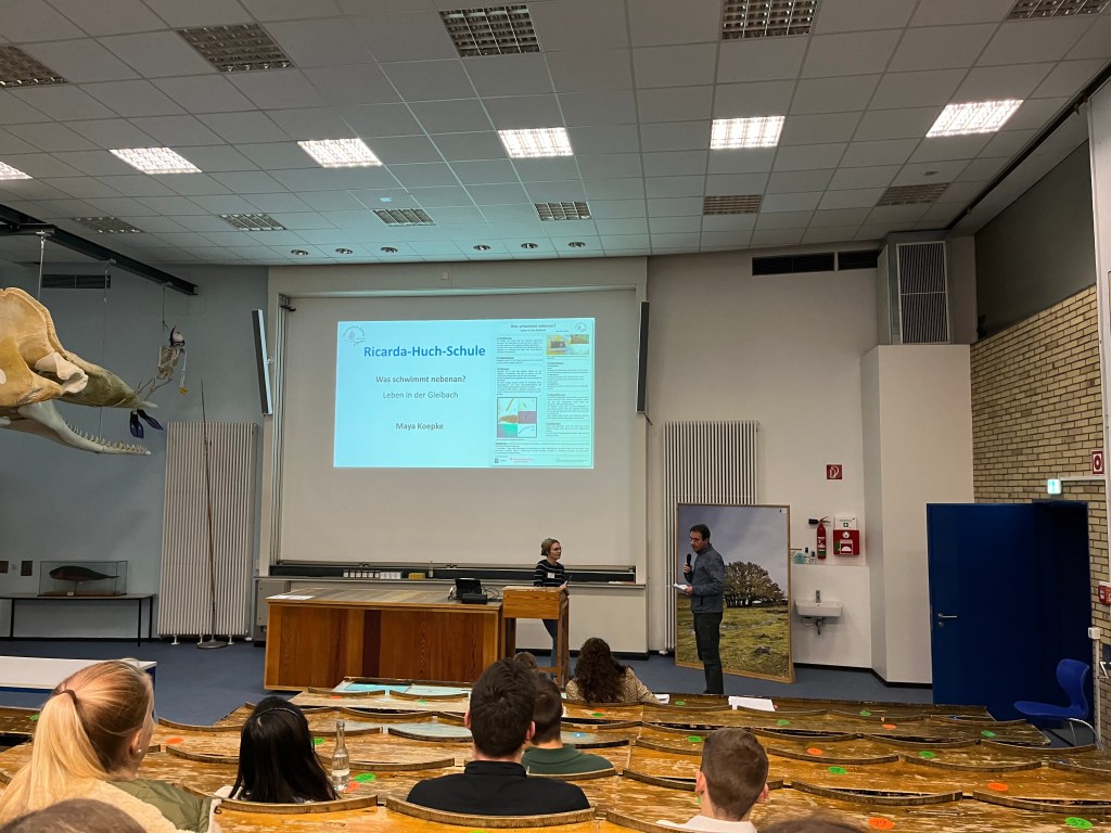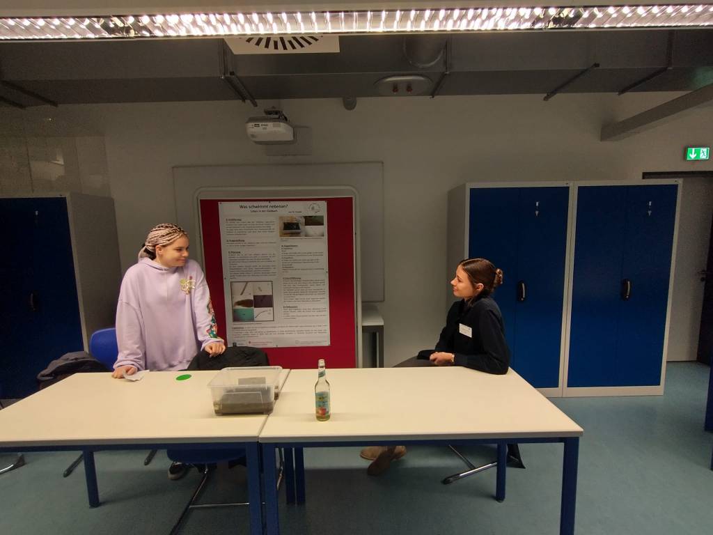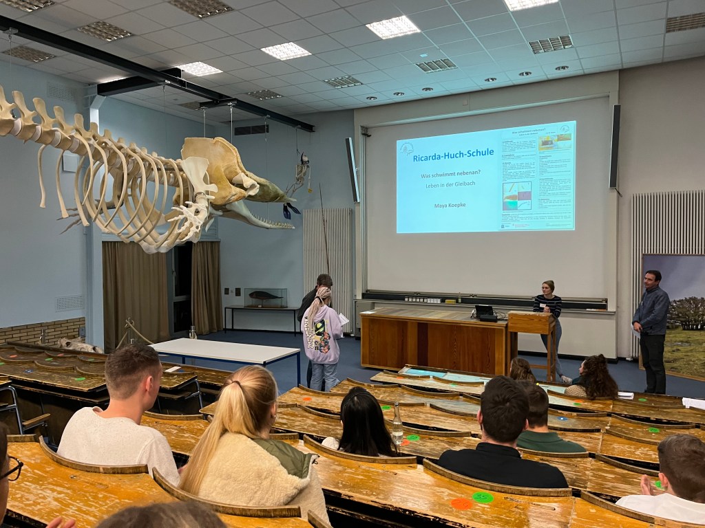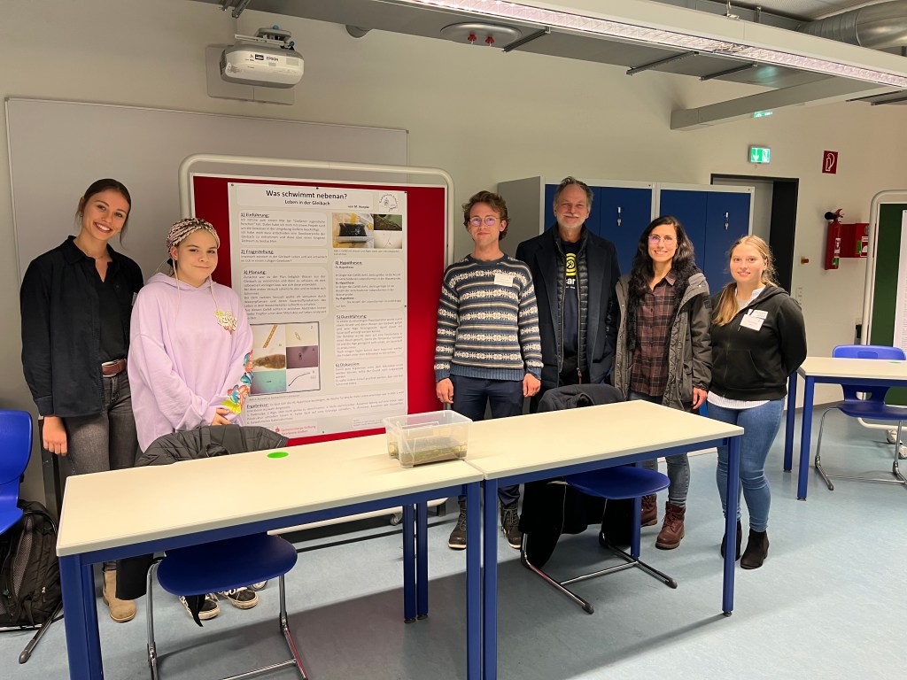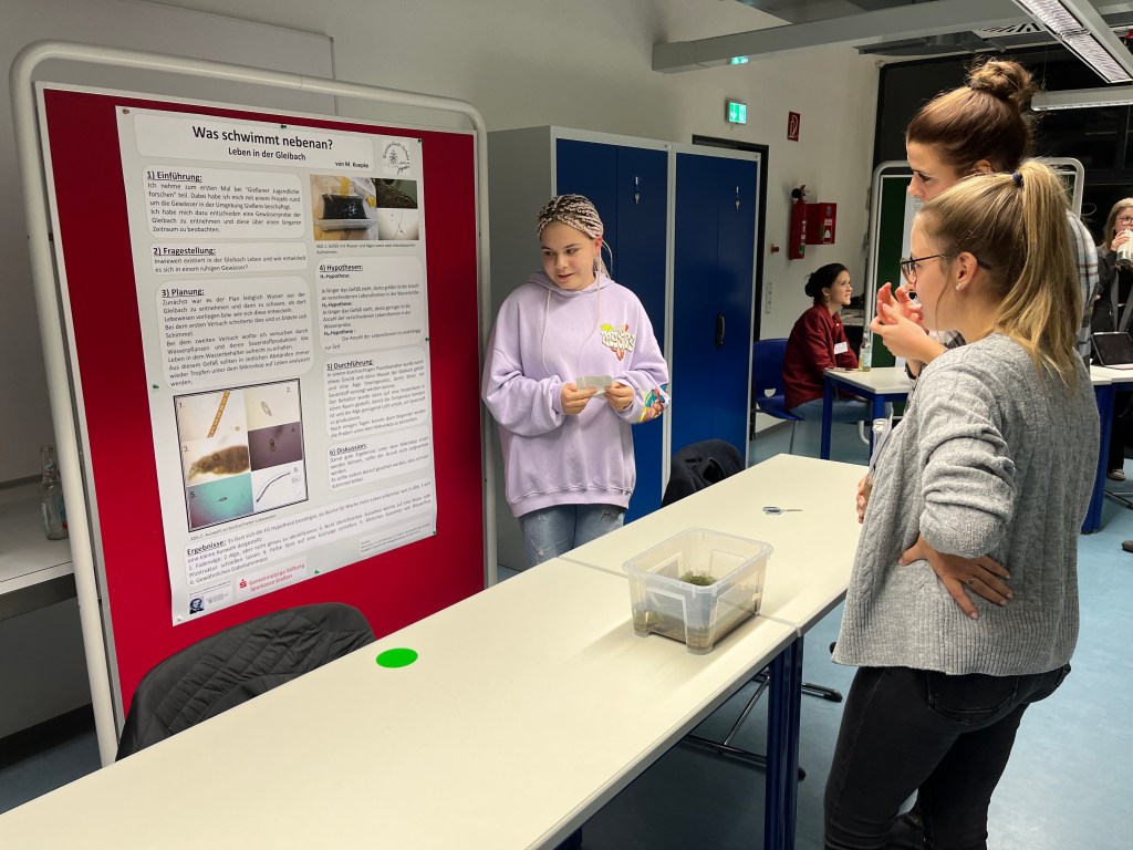 Dies waren in diesem Jahr für die Ricarda Herr Max Schramm, der als Schulkoordinator eine wichtige Schnittstelle zwischen Mentor:innen und der Schule darstellt, Selena Wirth, die Maya Koepke, Klasse 10b (und Emilia Geipert, 10b, die leider aus Zeitgründen später mit dem Projekt pausieren musste) tatkräftig bei ihrem Projekt „Was schwimmt nebenan? Leben in der Gleibach“ und der Vorbereitung der Projektpräsentation unterstützt hat. Die dritte Mentorin für die Ricarda-Projektgruppen war in diesem Jahr Hannah Freitag, die Fynn Lobedank (11d) bei seinem Projekt „Die erste Batterie und die Technik dahinter“ unterstützt hat. Fynn ist schon im dritten Jahr bei „Gießener Jugendliche forschen“ dabei, konnte dieses Jahr aber leider krankheitsbedingt sein Projekt nicht beim Wissenschaftsfestival präsentieren. Er hat aber – wie Maya- vor, seine Projektidee im nächsten Jahr fortzuführen.