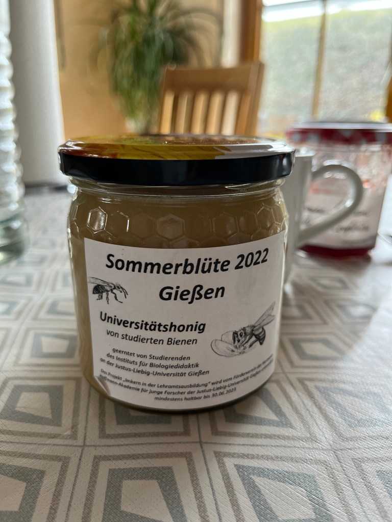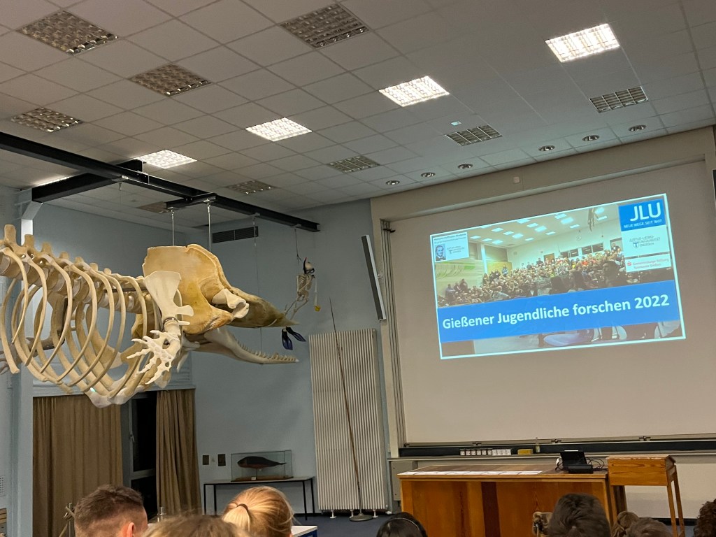 Die Präsentation der diesjährigen Projekte erfolgte Freitag, den 25.11.2022 im Rahmen des „Wissenschaftsfestivals“ an der Hermann-Hoffmann-Akademie. Hier stellten die Schüler:innen der Gießener Schulen ihre Projekte zunächst den Science-Coaches, also Wissenschaftler:innen der JLU vor, die ihnen viel Wertschätzung und inhaltliches Feedback entgegenbrachten. Im Anschluss war auch die Öffentlichkeit herzlich willkommen, sich von den Schüler:innen deren jeweilige Projekte erläutern zu lassen. Hier ließ es sich auch der Schulleiter der Ricarda, Peer Güßfeld, nicht nehmen, persönlich vorbeizukommen. Die Urkunden wurden im feierlichen Rahmen im Hörsaal der Hermann-Hofmann-Akademie, der das inzwischen regional berühmte und imposante Walskelett beherbergt, überreicht. Auch den Sponsoren und den vielen Unterstützern des Projektes „Gießener Jugendliche forschen“ wurden an dieser Stelle gedankt. Hier erhielten die an den Schulen betreuenden Lehrkräfte als Dankeschön und Würdigung ihrer Arbeit ein Glas Honig von „studierten Bienen“ der JLU. Für die Ricarda durfte Nadia Rausch (Leiterin AG), die seit Beginn an, die Koordination Betreuung dieses Projektes an der Ricarda-Huch-Schule übernommen hat, den Honig entgegennehmen.