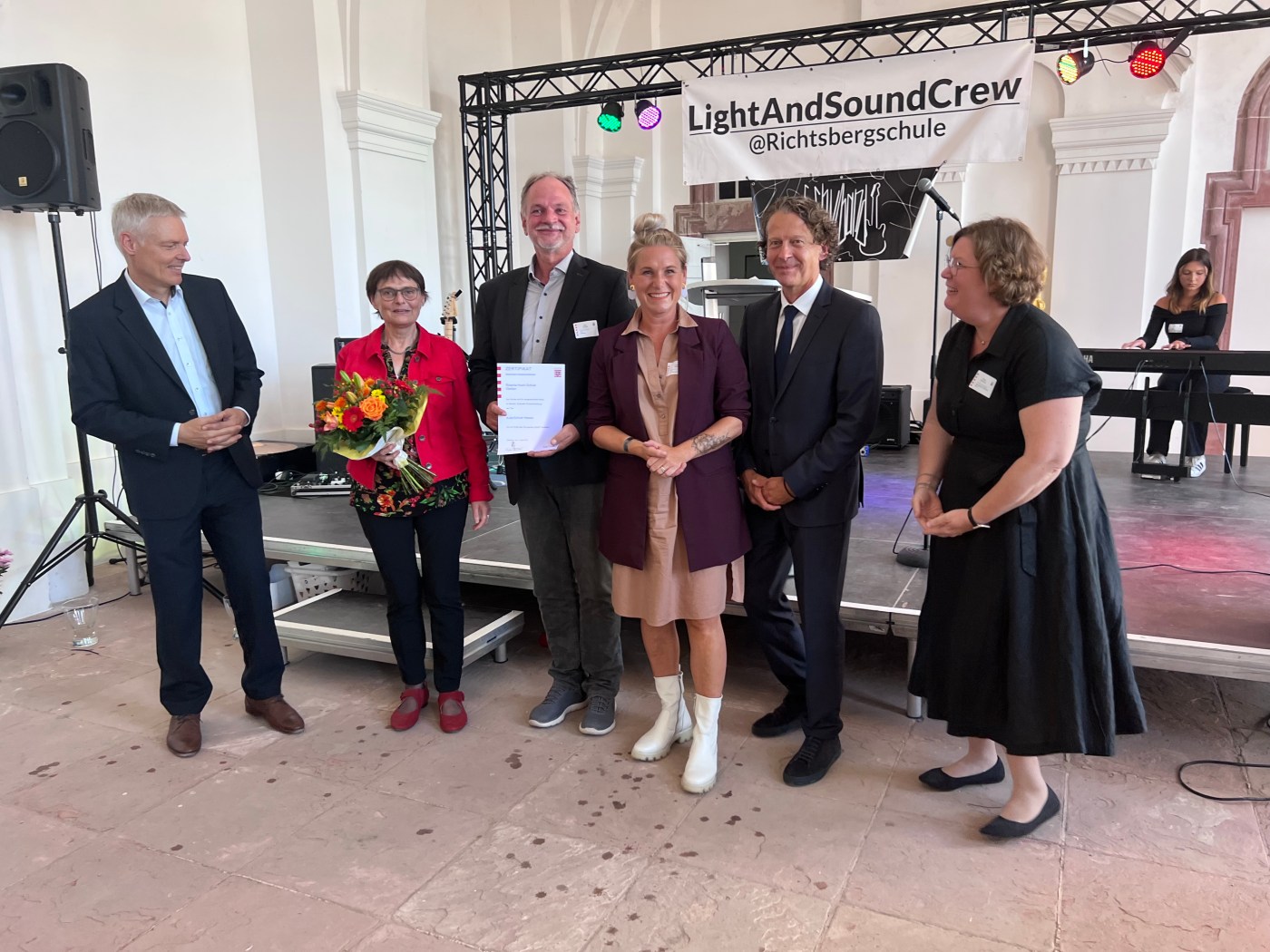 Auf dem Titelbild sind ferner zu sehen die Gratulant:innen Marcus Kauer, Leiter des Referats Kulturelle Bildung im Kultusministeriums sowie ganz rechts Wiebke Struckmeier, Koordinatorin für die KulturSchulen im Büro Kulturelle Bildung.