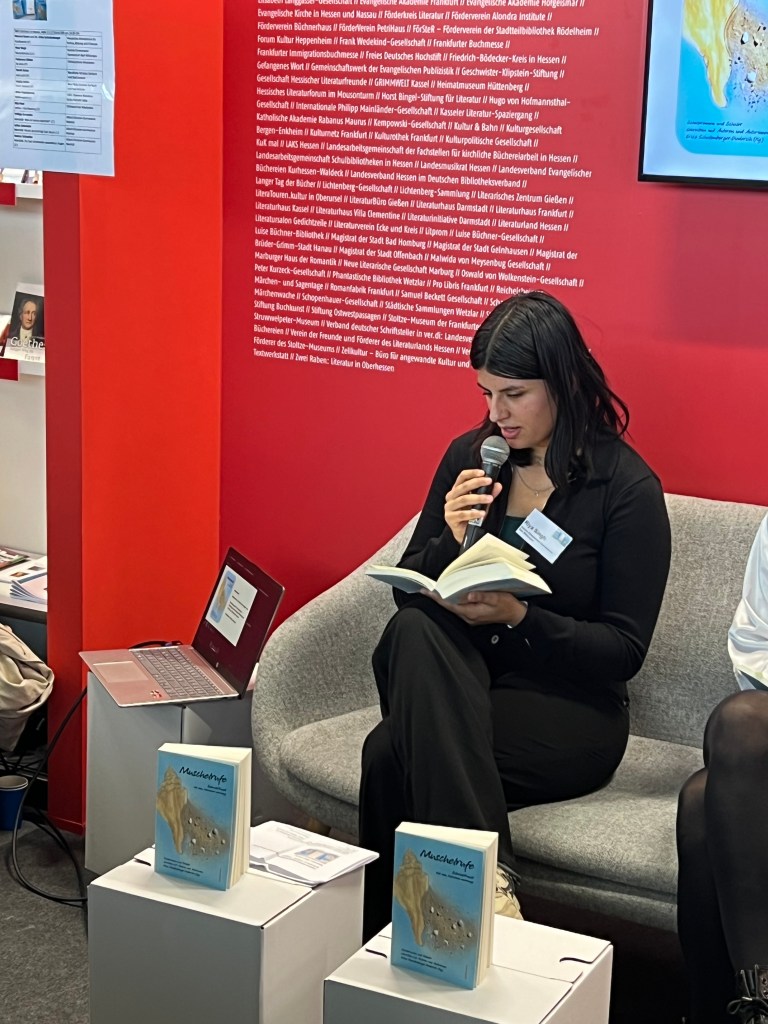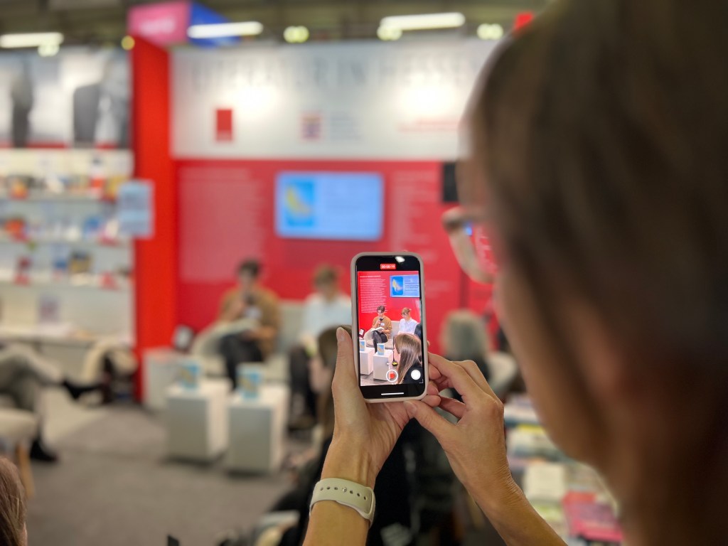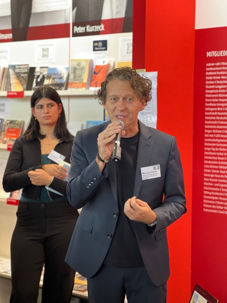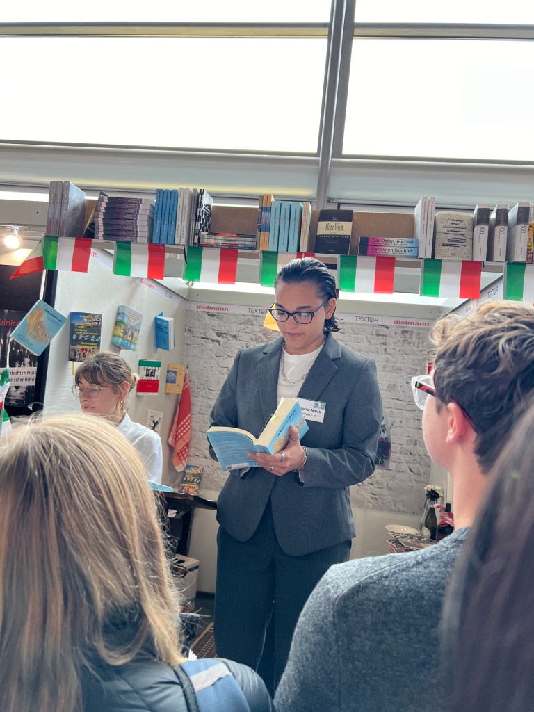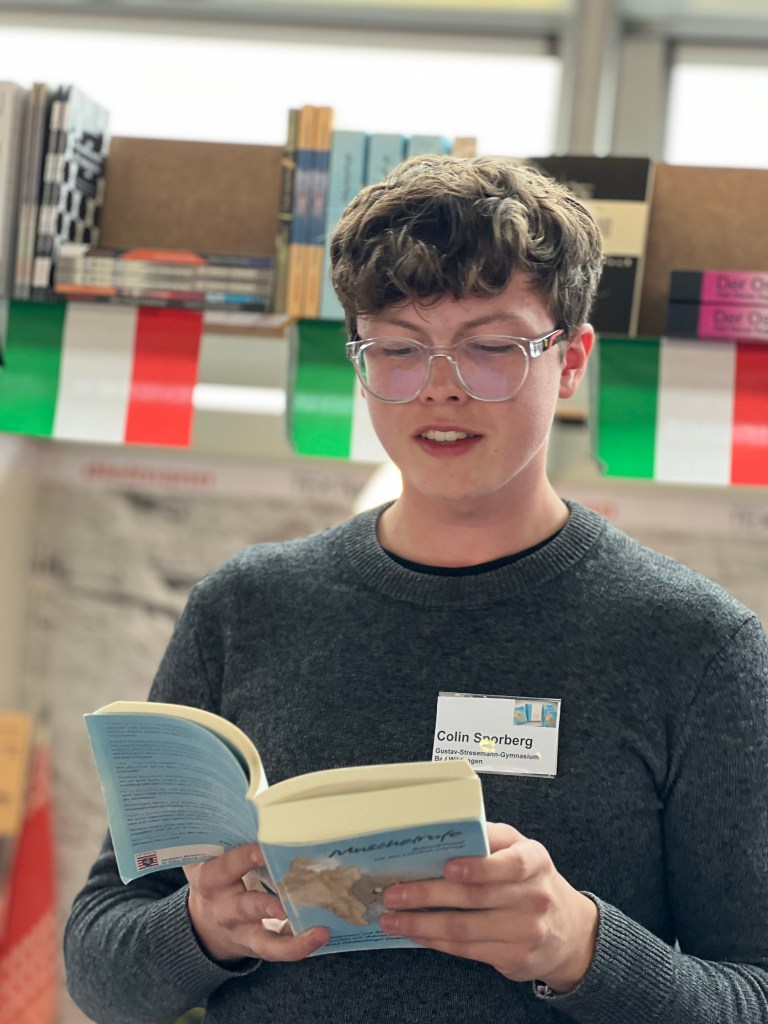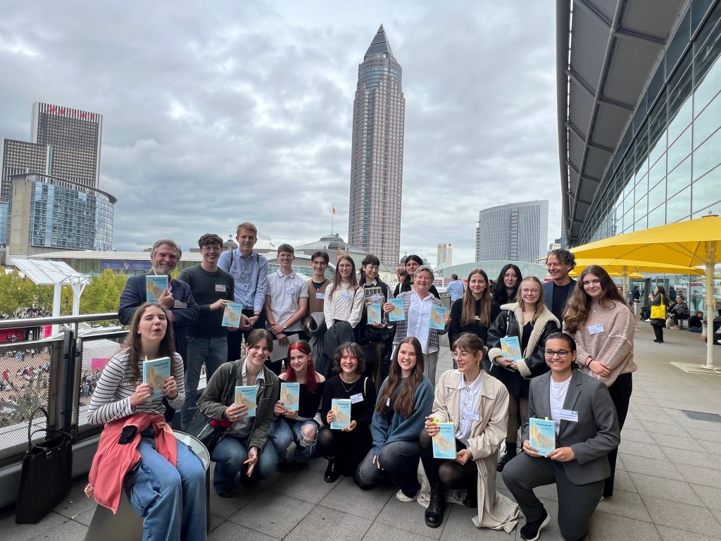 In den Ferien stellte eine Delegation das Buch gemeinsam mit Stella Jantosca bei einem phänomenalen Auftritt auf der Frankfurter Buchmesse einem großen und interessierten Publikum vor, ein Erlebnis „das man so schnell nicht mehr vergisst“ – so ein beteiligter Schüler. Dicht drängte man sich in den überfüllten Hallen, versuchte einen Blick, ein Wort zu erhaschen – alles Literaturbegeisterte – einfach Wahnsinn!!!