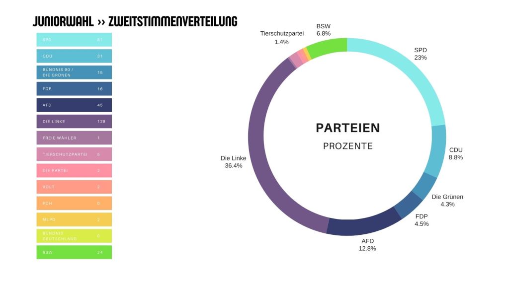 Hier gibt es die Ergebnisse der Juniorwahlen. Die Parteien sind nicht in den passenden Farben, aber doch gut unterscheidbar. Viel Spaß damit!