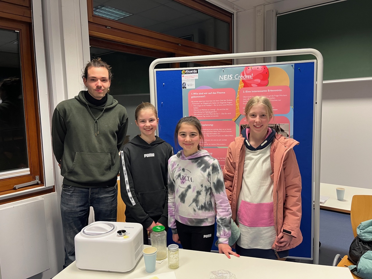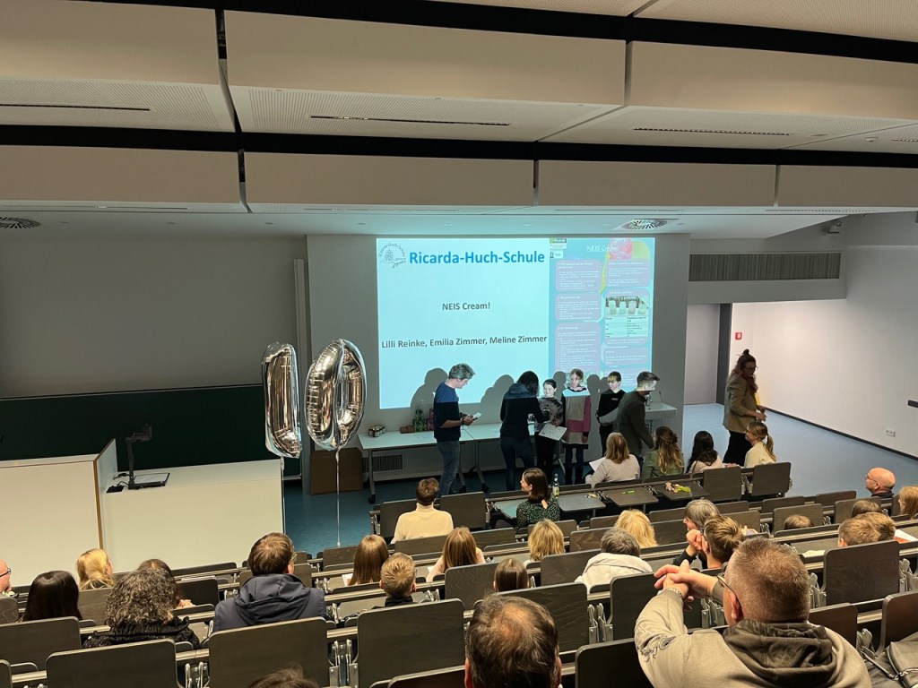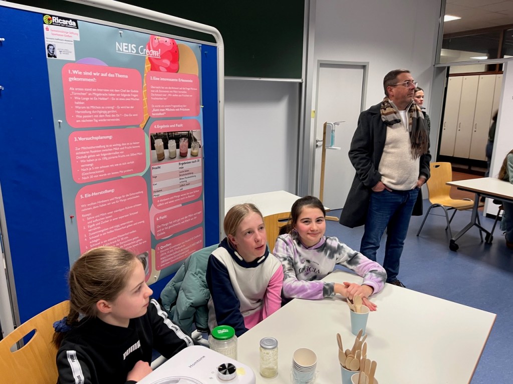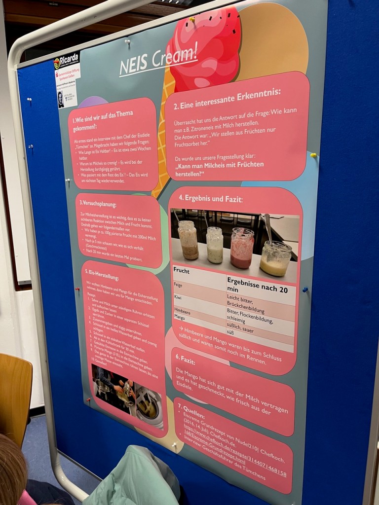 Dieses Jahr jährte sich das Wissenschaftsfestival für junge Forscherinnen und Forscher zum 10. Mal und die Ricarda war bereits zum 9.Mal dabei, diesmal mit der Präsentation des Projektes „NEis Cream“ der Schülerinnen der 7a Meline Zimmer, Emilia Zimmer und Lilly Reinke.