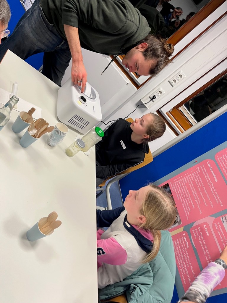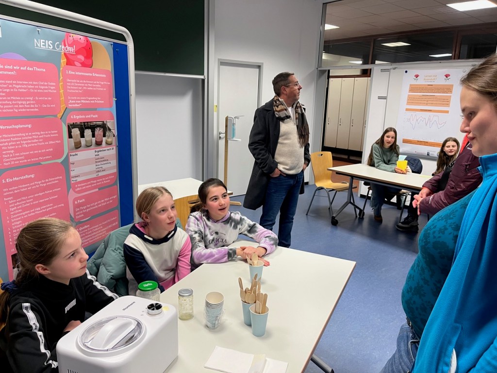 Dieses Jahr haben die Schülerinnen Meline Zimmer, Emilia Zimmer und Lilly Reinke daran geforscht, wie man ein eigenes Speiseeis herstellt. Zunächst haben sie sich die Frage gestellt, warum es bestimmte Eissorten eigentlich gar nicht gibt (z.B. Kiwi-Eis). Dazu haben sie ein Interview mit dem Chef der Eisdiele im „Türmchen“ geführt und darauf aufbauend wissenschaftlich fundiert, mit Fragestellung, Versuchsplanung, Durchführung und Auswertung, schließlich ein leckeres Mango-Eis hergestellt. Das durfte selbstverständlich von dem interessierten Publikum des Wissenschaftsfestivals probiert werden.