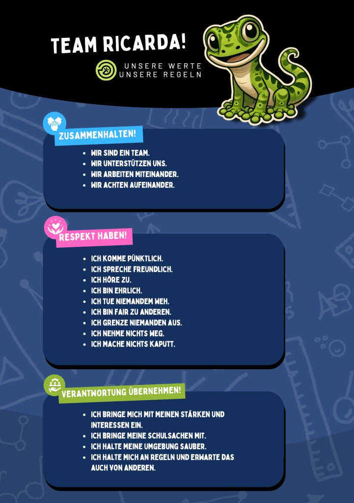 So haben wir uns gekümmert um die Werte und Regeln, die unser Zusammenleben wie auch unser pädagogisches Wirken an der Ricarda leiten sollen. Viele erscheinen gewiss euch und Ihnen als selbstverständlich. Das sehen wir auch so und wollen sie daher auch selbstbewusst einfordern.
