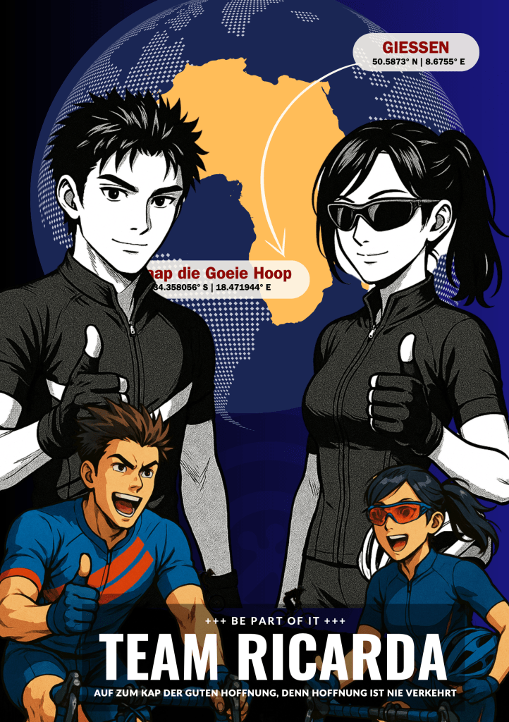 Mit diesem Jahr wäre die RICARDA das sechste Jahr in Folge dabei. Im ersten Jahr waren wir etwa 30 Radlerinnen und Radler und hatten immerhin gute 5000 Kilometer zusammengestrampelt, was schon einmal einen respektablen Pro-Kopf-Durchschnitt ergab. Davon angestachelt hatten wir uns die folgenden Jahre dann ambitionierte 40.000 Kilometer vorgenommen. Kontinuierlich wurden es mehr Teilnehmerinnen und Teilneher, die an den Start gingen, doch einmal rum um den Globus schafften wir leider nie. Nun, „auch nur gewollt zu haben, genügt in großen Dingen“ so sprach es bereits der umbrische Elegiker Properz vor Christi Geburt und doch wollen wir in diesem wie auch schon im letzten Jahr unsere Erwartungen etwas anpassen, in der Hoffnung, das Gewollte dann doch zu schaffen! In guter Hoffnung sozusagen 😉