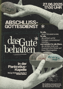 Und das wollen wir gerne gemeinsam tun und feiern – zusammen mit dem Ricarda-Lehrerchor, zusammen in einem Gottesdienst, zu dem jede und jeder, zu dem alle Schülerinnen und Schüler, zu dem alle Eltern sowie alle Kolleginnen und Kollegen ganz herzlich eingeladen sind.