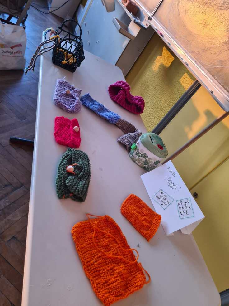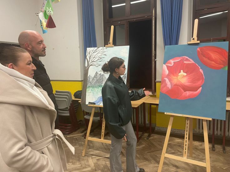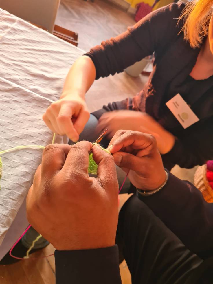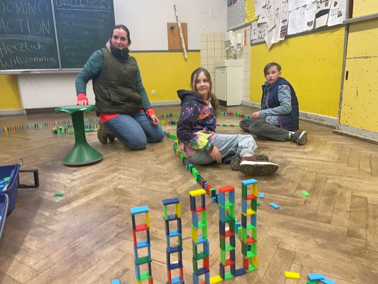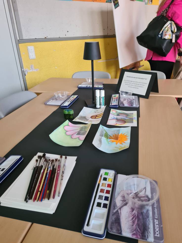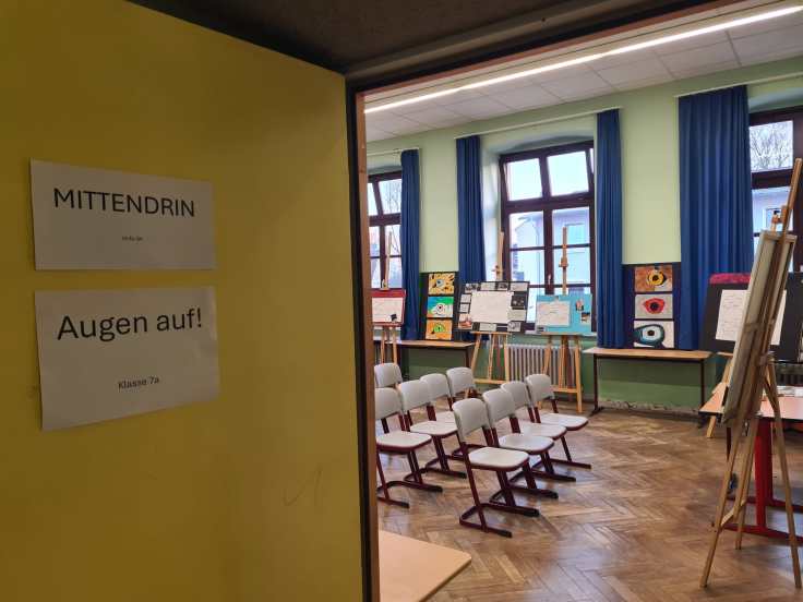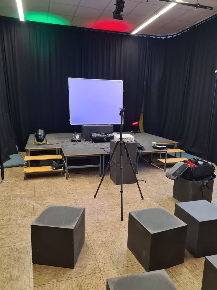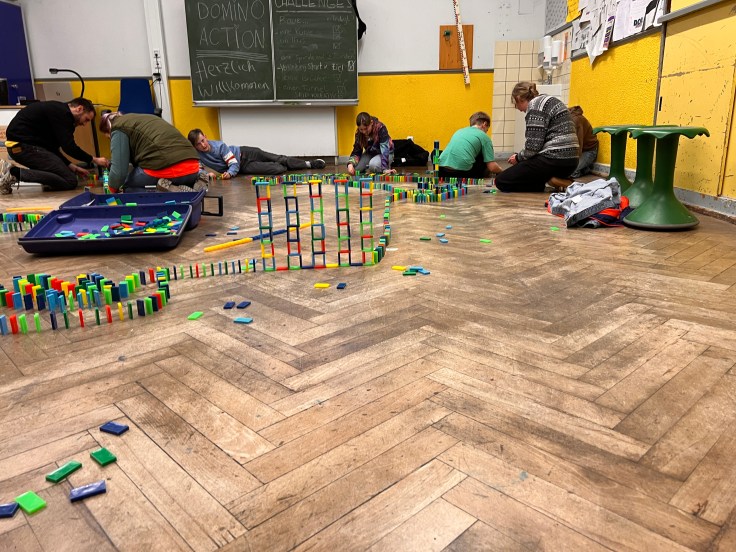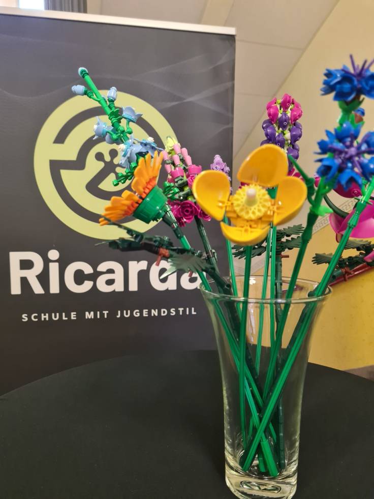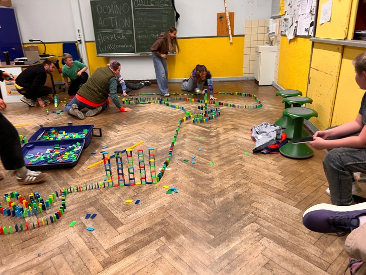 Als sich dann die Türen von Haus B öffneten und Schulleiter Peer Güßfeld, begleitet von den legendären Voice Guys – einer A-cappella-Combo aus aktiven und ehemaligen Lehrkräften der Ricarda –, die Gäste stimmungsvoll begrüßte, fiel all diese Anspannung auf einmal ab. Das vielseitige Programm kam ins Rollen, und plötzlich wurde alles leicht. Der Abend floss, fast wie von selbst, elegant ineinander. Überall gab es etwas zu entdecken, zu bestaunen und vor allem: mitzumachen. Man durfte sich künstlerisch betätigen, Roboter programmieren, am Domino-Parcours mitbauen, in gemütlichen Sesseln am Ricarda-Schal mitstricken, Bilder ersteigern, Salsa tanzen oder sogar Teil eines Theaterstücks werden.
