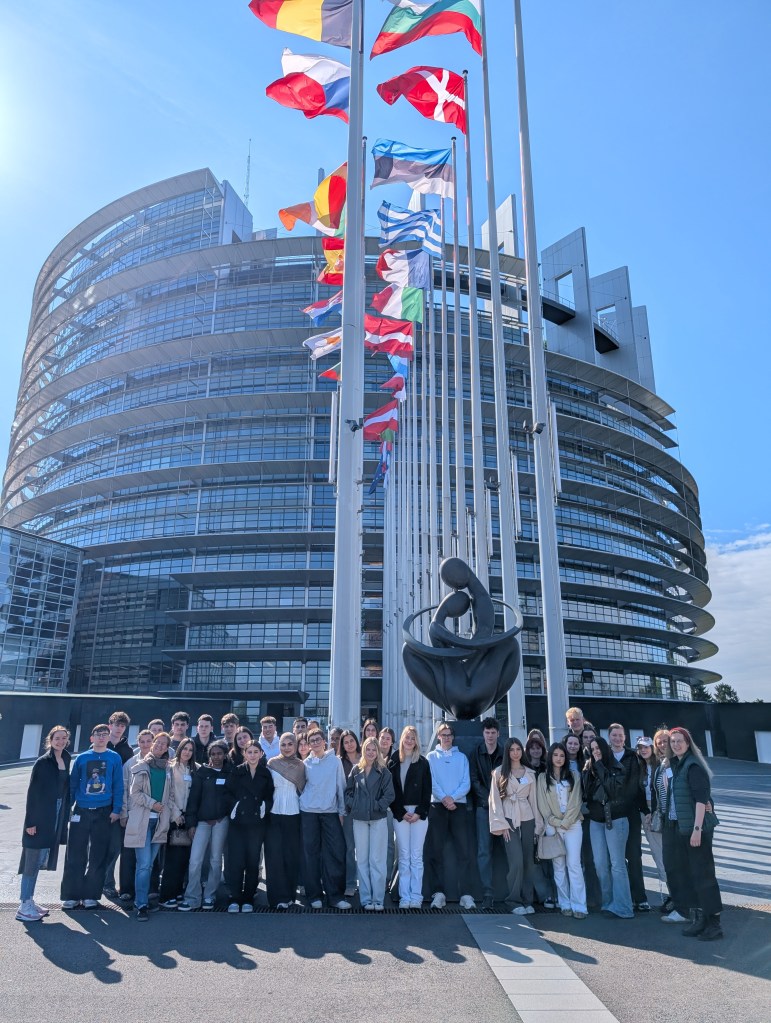Um diese positive Perspektive als Ausklang der Studienfahrt zu nutzen, fuhren die Leistungskurse der Ricarda-Huch-Schule am letzten Tag nach Straßburg, wo sie das Europaparlament besichtigten. Dort sprachen die Lernenden über die Fraktionen und Länder des Europaparlaments, über die dort verwendeten Sprachen und wie Gesetze zwischen Europarat und Parlament verhandelt werden.