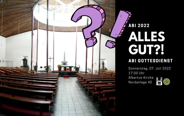 Einladung zum diesjährigen Abi-Gottesdienst am 07. Juli 2022 - 17:00 Uhr in der Albertuskirche unter dem oben stehenden Motto "Alles gut ?! Liebe Abiturientinnen und Abiturienten,liebe Kolleginnen und Kollegen,liebe Eltern, auch auf diesem Weg möchte ich Euch und Sie alle sehr herzlich einladen zum diesjährigen Abi-Gottesdienst am Donnerstag, den 7. Juli, um 17 Uhr in der... Continue Reading →