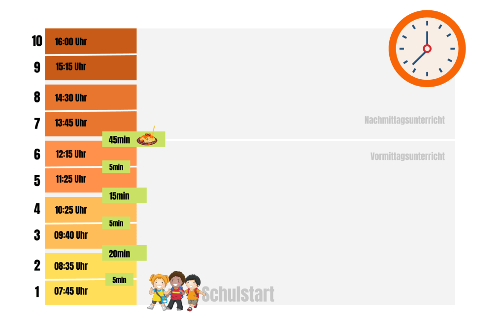 Schulstart bzw. Unterrichtsbeginn ist um 07:45 Uhr. Der Unterricht ist, wenn möglich, insbesondere am Vormittag in Doppelstundenblöcken organisiert. Die Fünfminutenpausen sind eingeplant, können aber innerhalb dieser Blöcke frei eingerichtet werden. Um Unterricht anderer Klassen nicht zu stören, sollten diese Pausen dann innerhalb der Klassen verlebt werden.